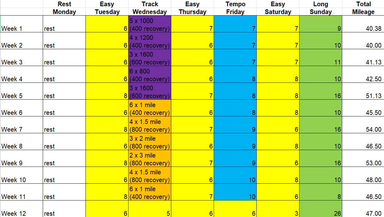 The plan is straightforward and has a few key components. You should be in relatively decent running shape before diving into this. If you are just starting out, take 4-8 weeks to get to base weekly mileage of at least 30 miles a week before starting this program. Mileage week over week generally should only increase by 10%.
